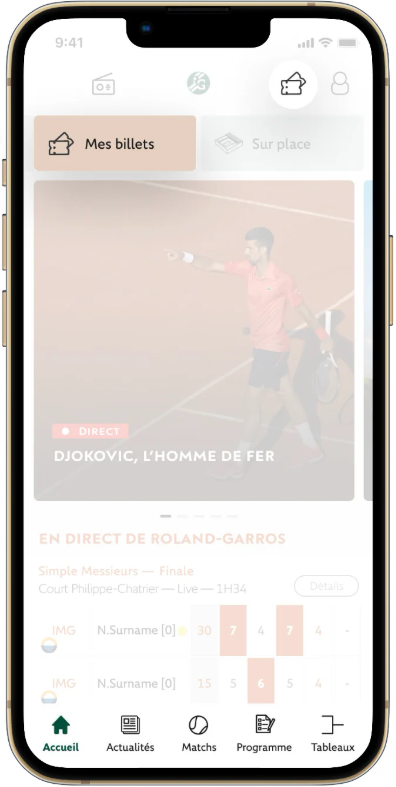 Le compagnon indispensable pour vivre pleinement l’expérience Roland-Garros. Retrouvez vos billets, suivez le Tournoi en direct, découvrez des contenus exclusifs… et bien plus encore ! Téléchargez l’application dès maintenant.